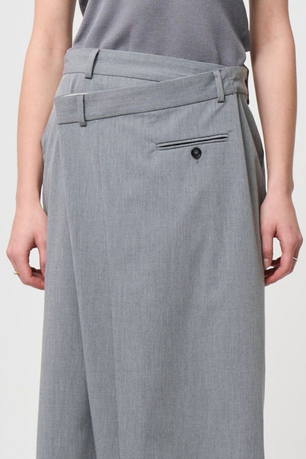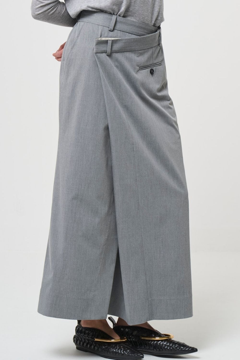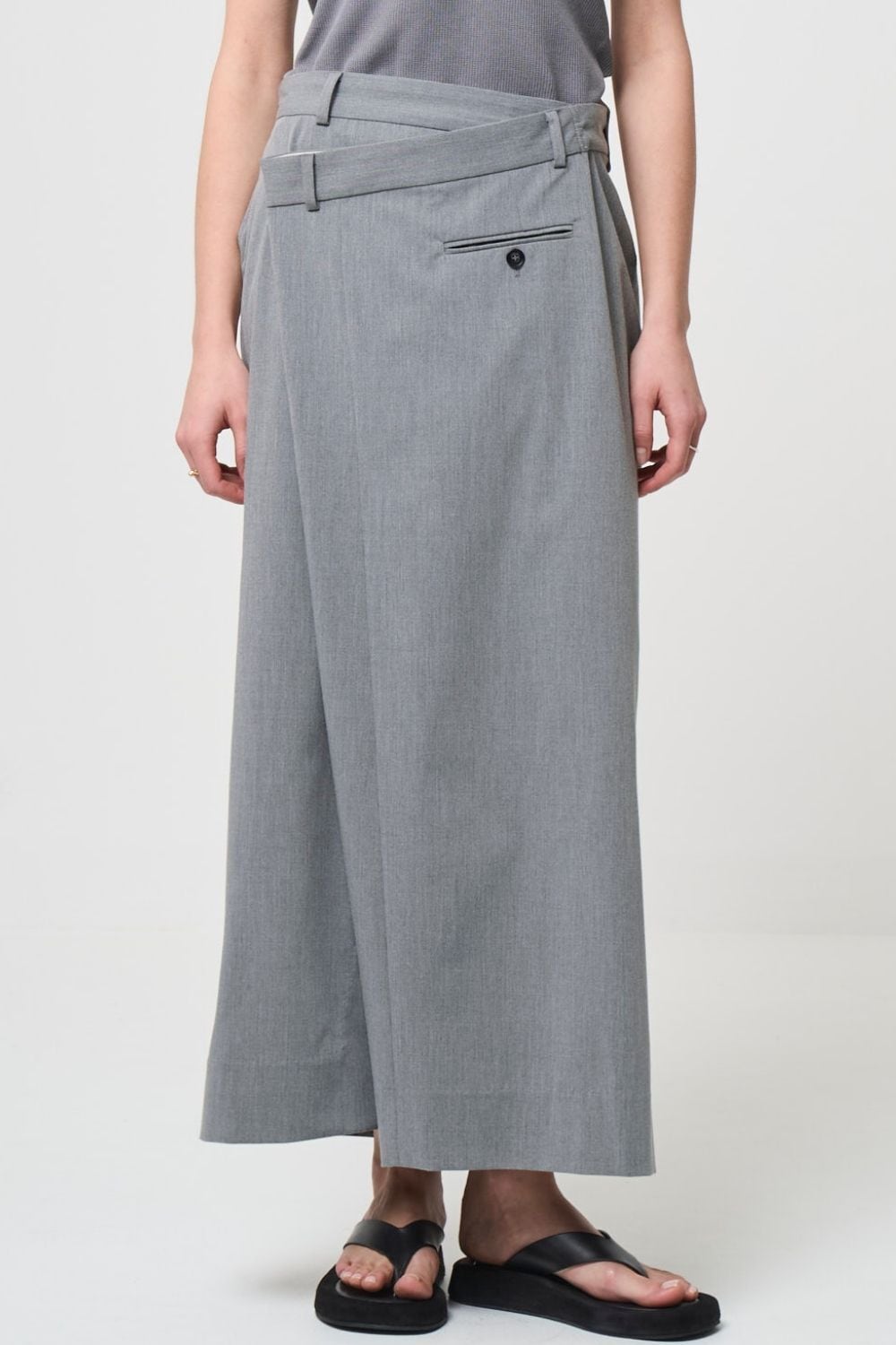 モード感が漂うアシンメトリーのラップスカート