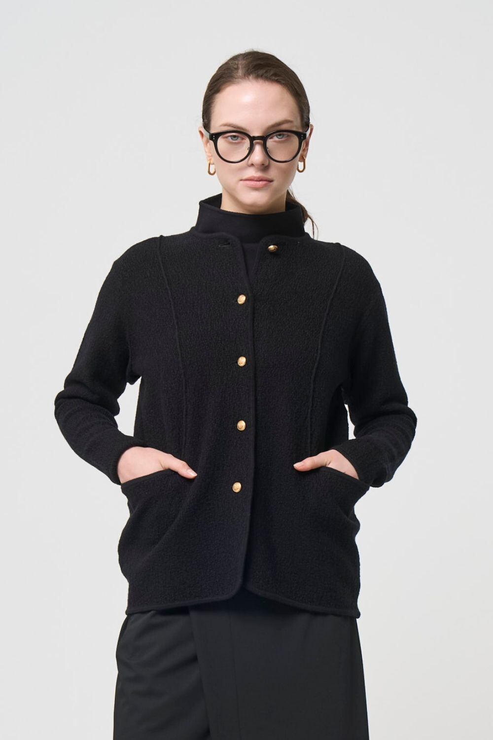 Featuring a bouclé-like knit pattern, this relaxed jacket offers dimensionality and a soft, comfortable feel against the skin.