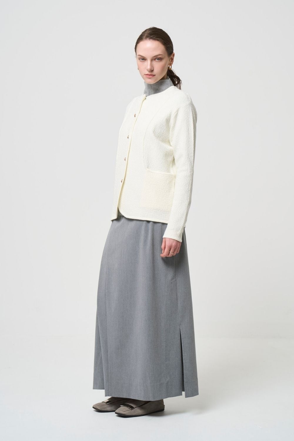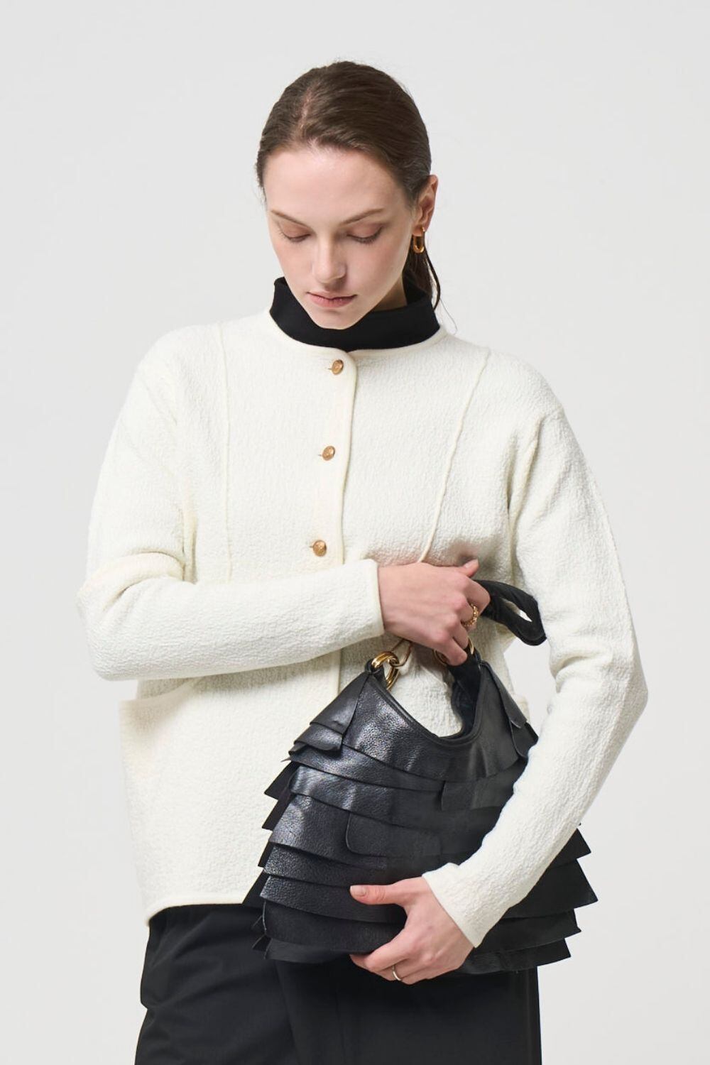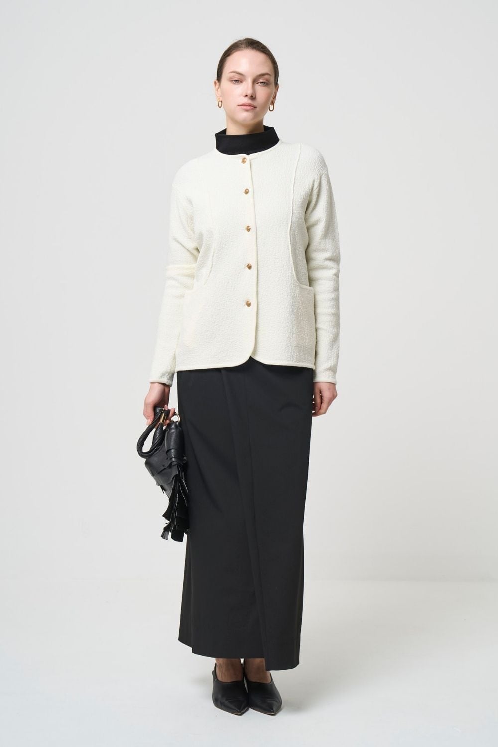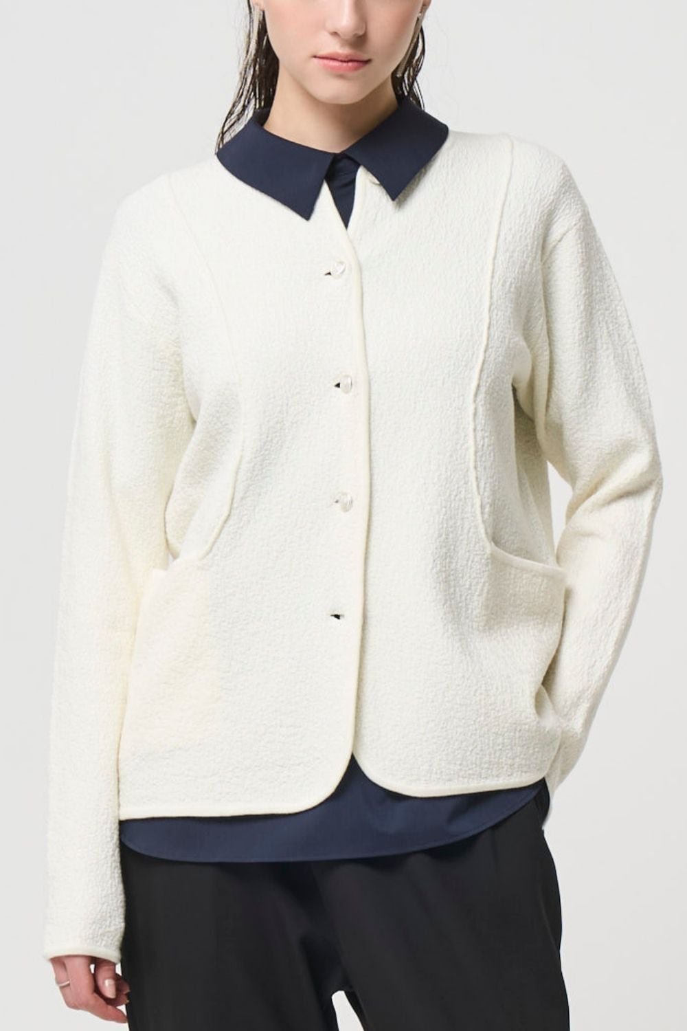 Featuring a bouclé-like knit pattern, this relaxed jacket offers dimensionality and a soft, comfortable feel against the skin.