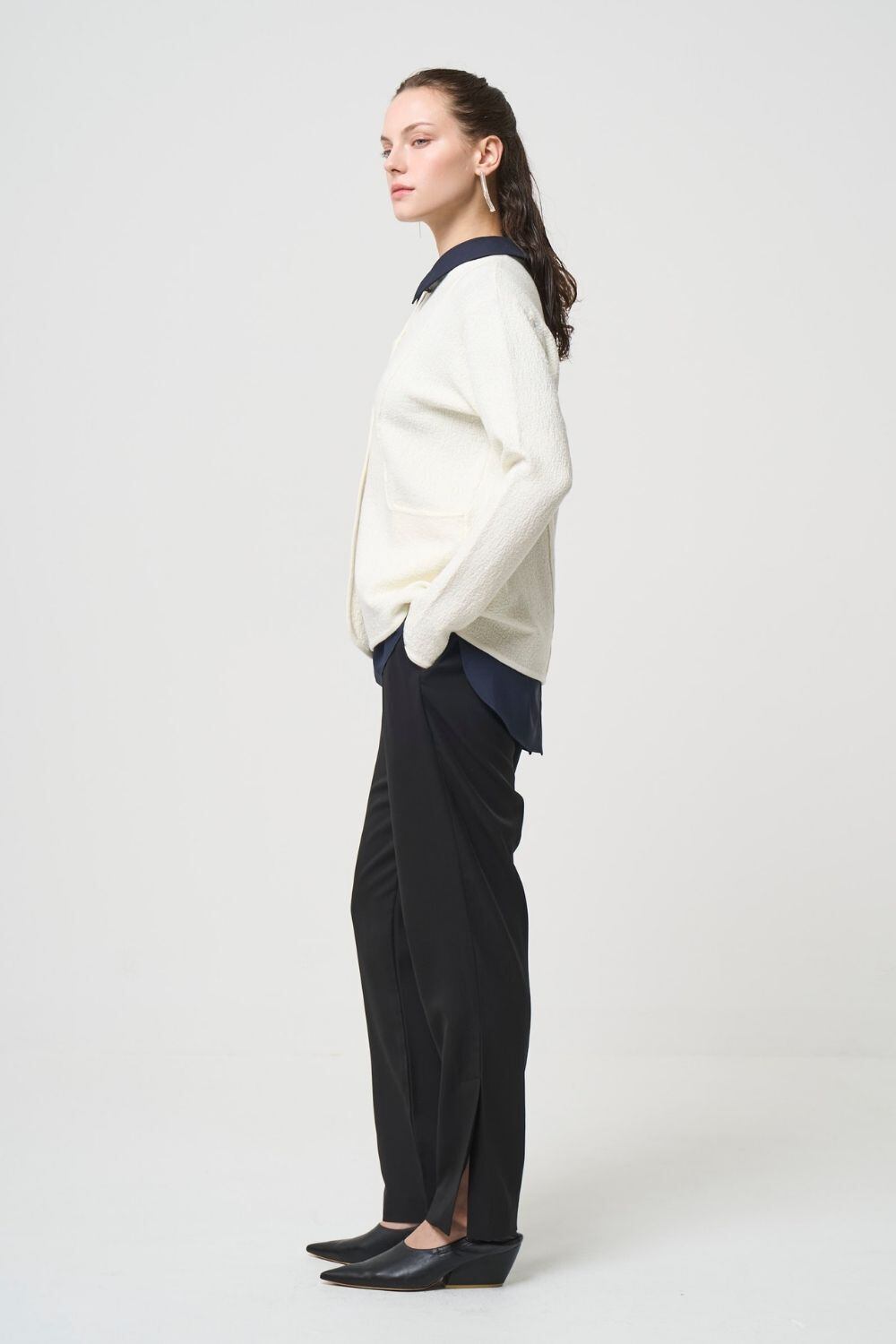 伸縮性のあるニット地のため、細身の割にINにもニットなどを入れて楽しめます