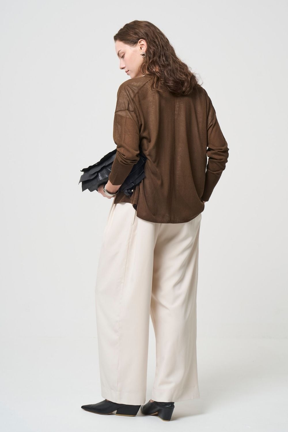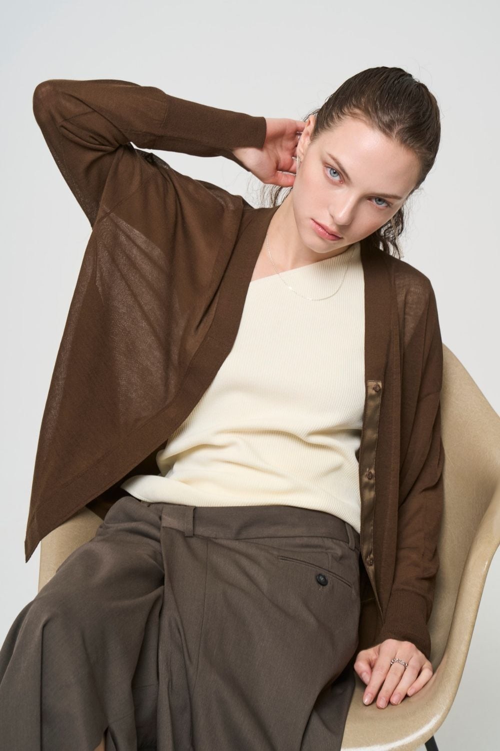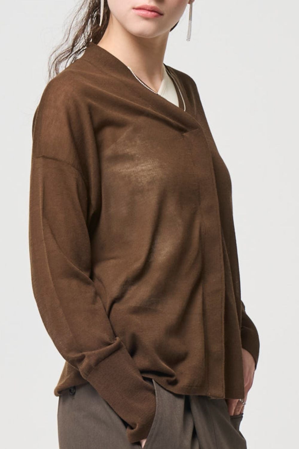 首元から裾にかけての深いVネックラインには、あえて太めのリブを配置してシャープな印象に
