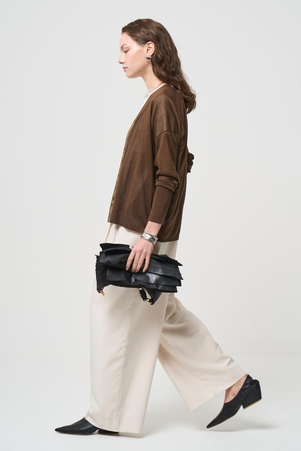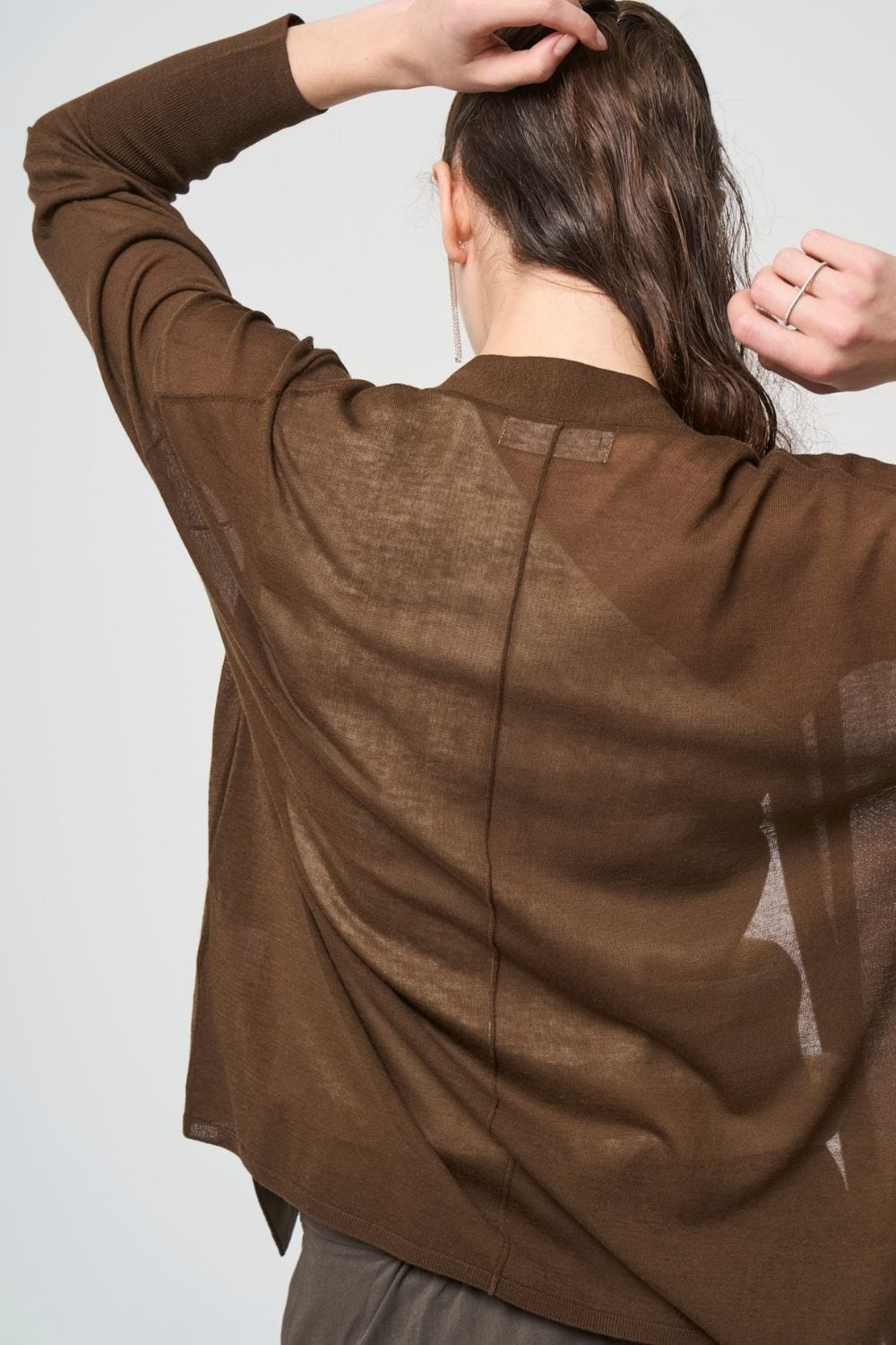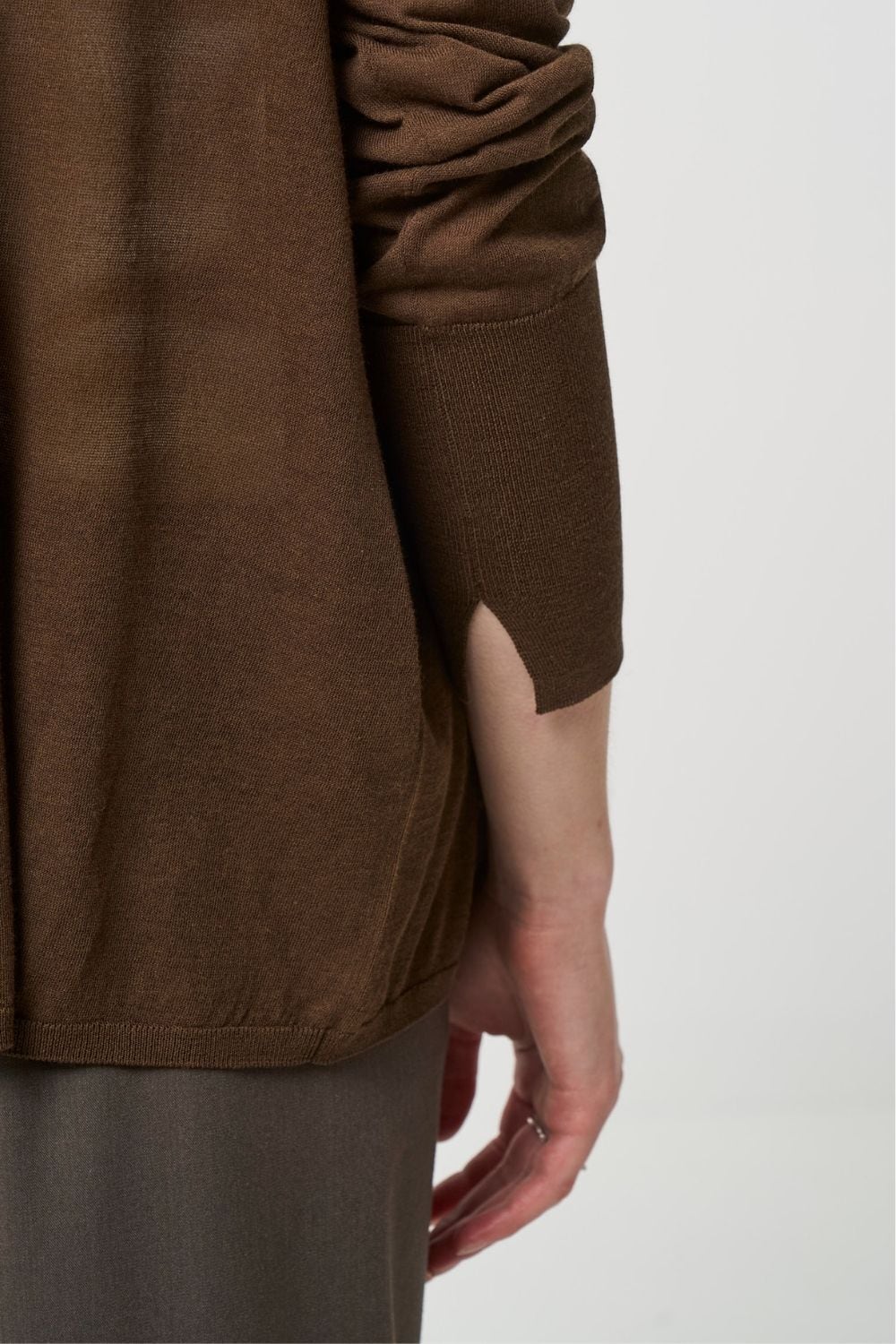 首元から裾にかけての深いVネックラインには、あえて太めのリブを配置してシャープな印象に