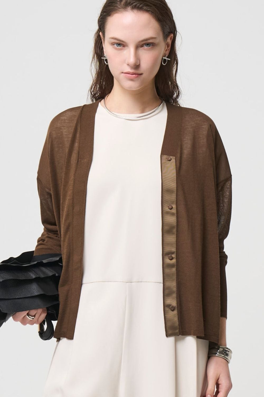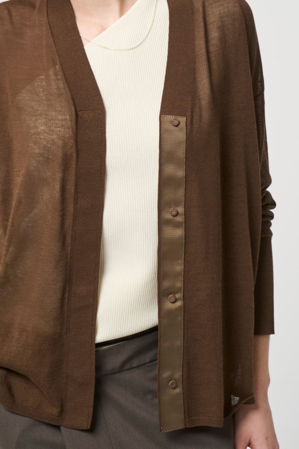 ただの冷房対策カーディガンではなく、太めのリブやグログランテープなど、デザインのこだわりを忍ばせています