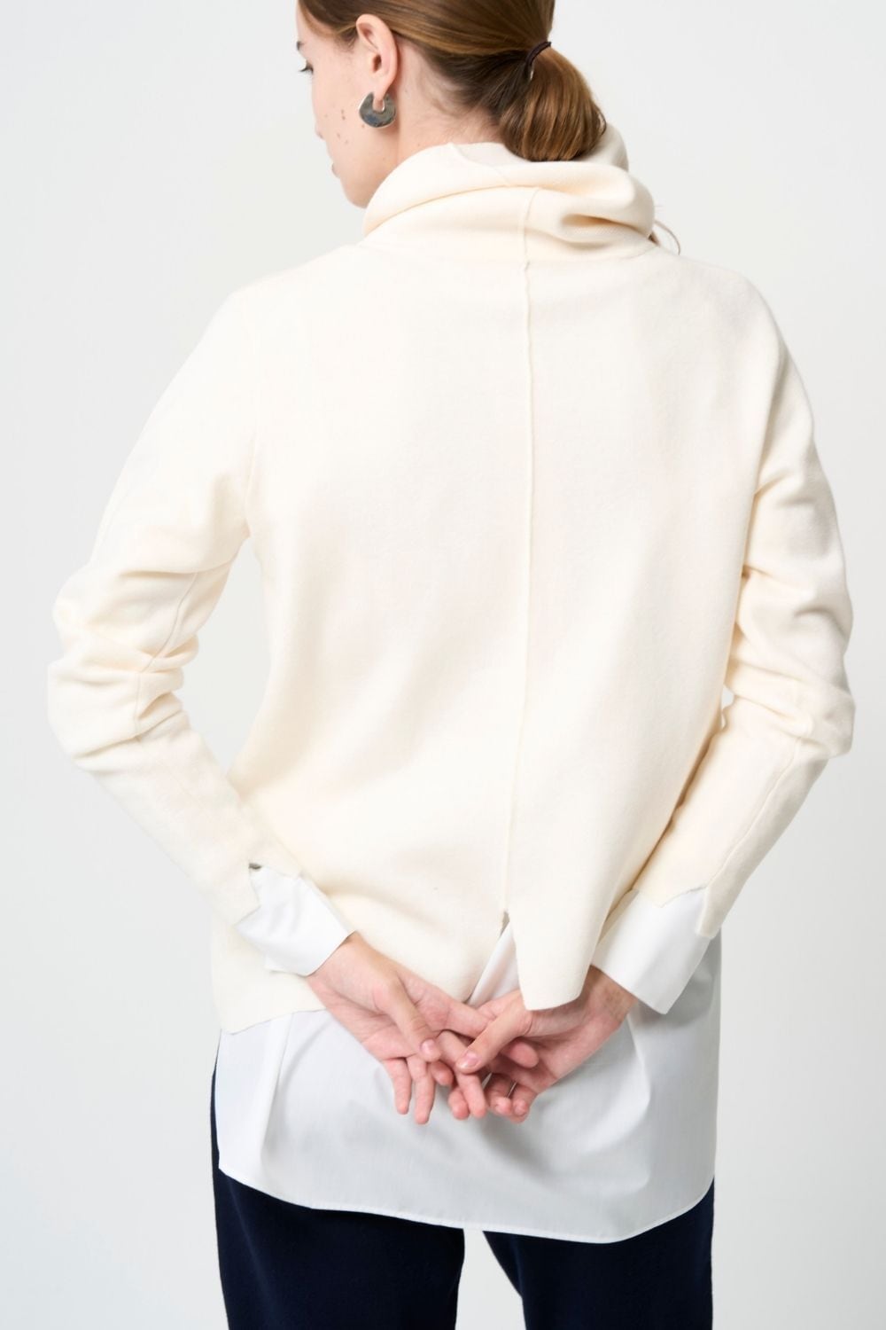 - ロングカフスの袖口は内側にゴムを仕込み、腕のどこでもとめられます