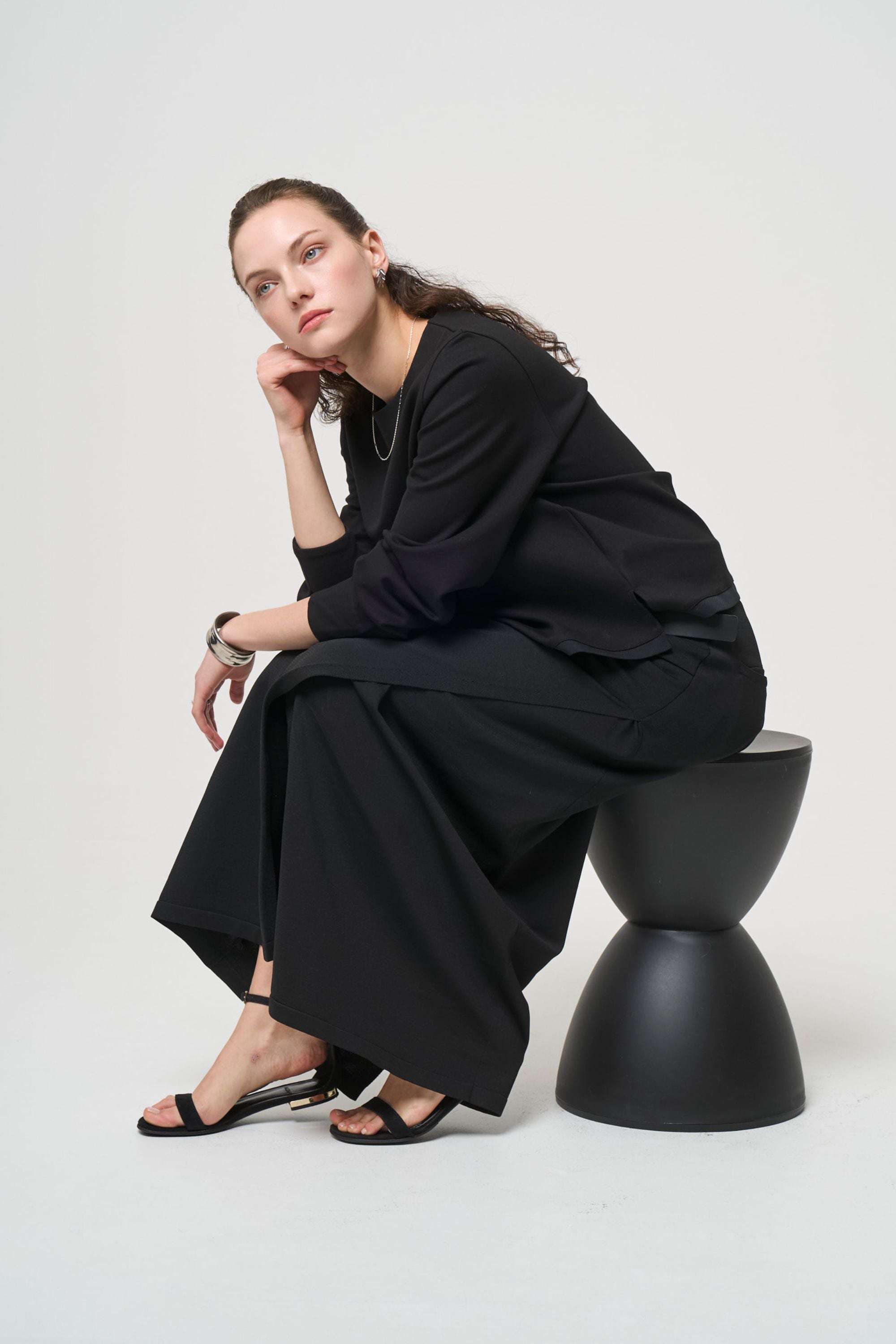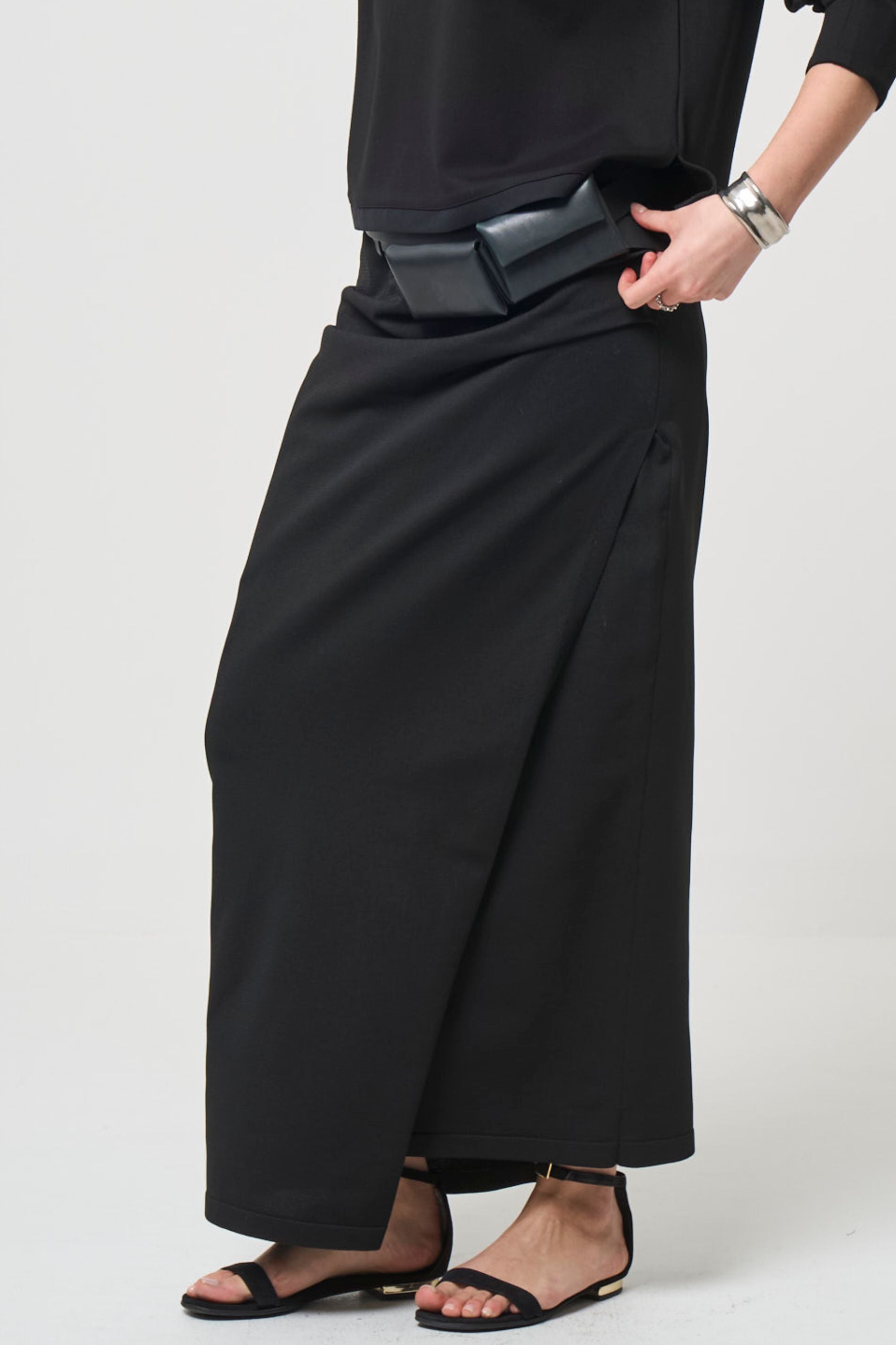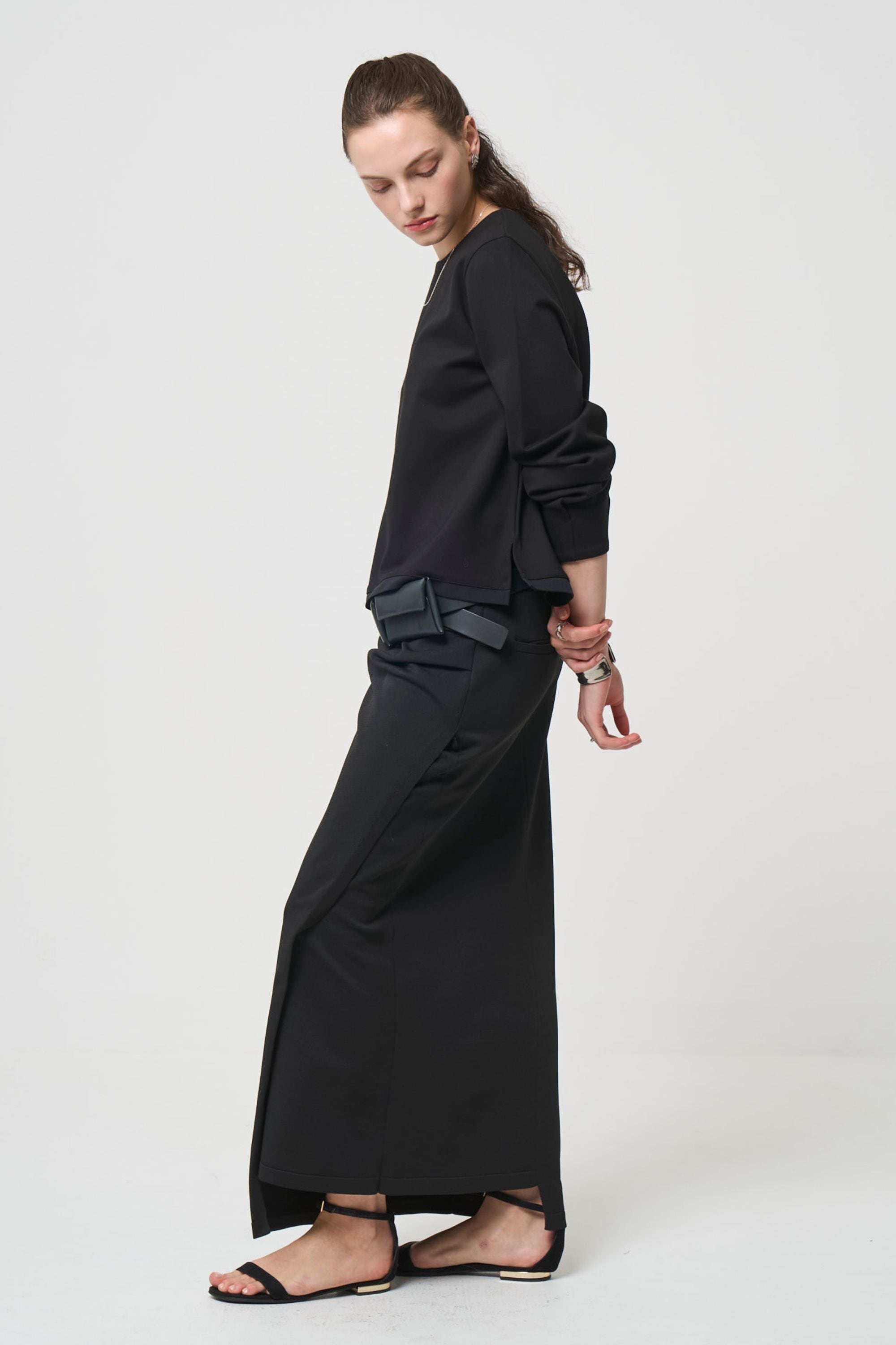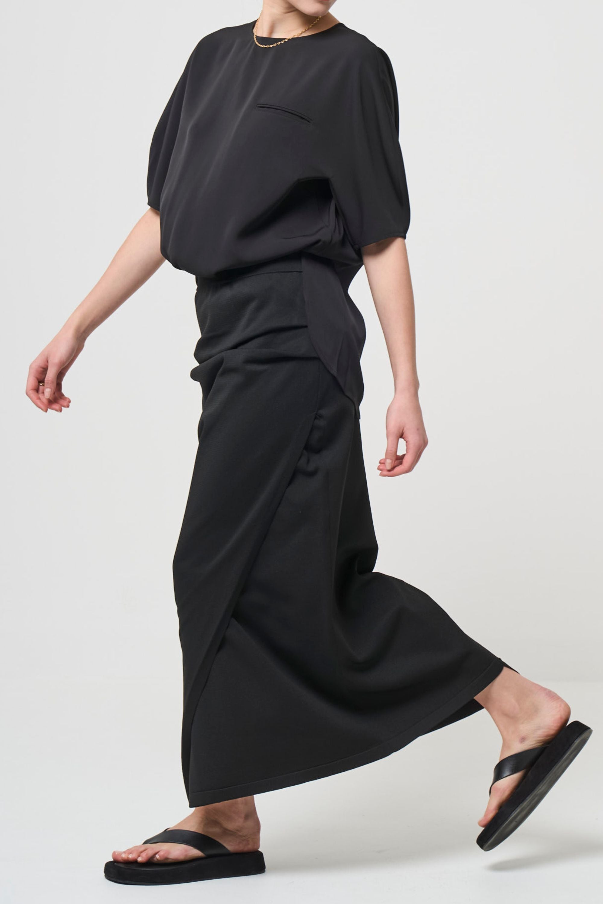 ウエスト部分に左右アシンメトリーなタックを入れて