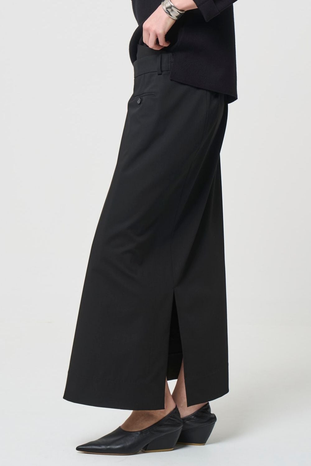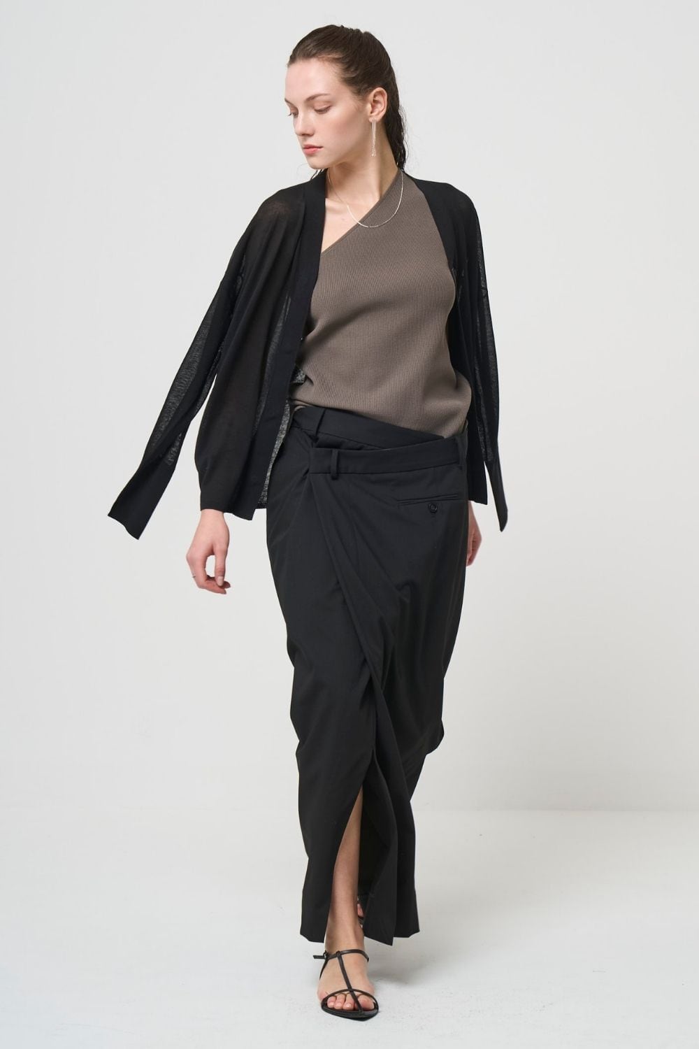 モード感が漂うアシンメトリーのラップスカート
