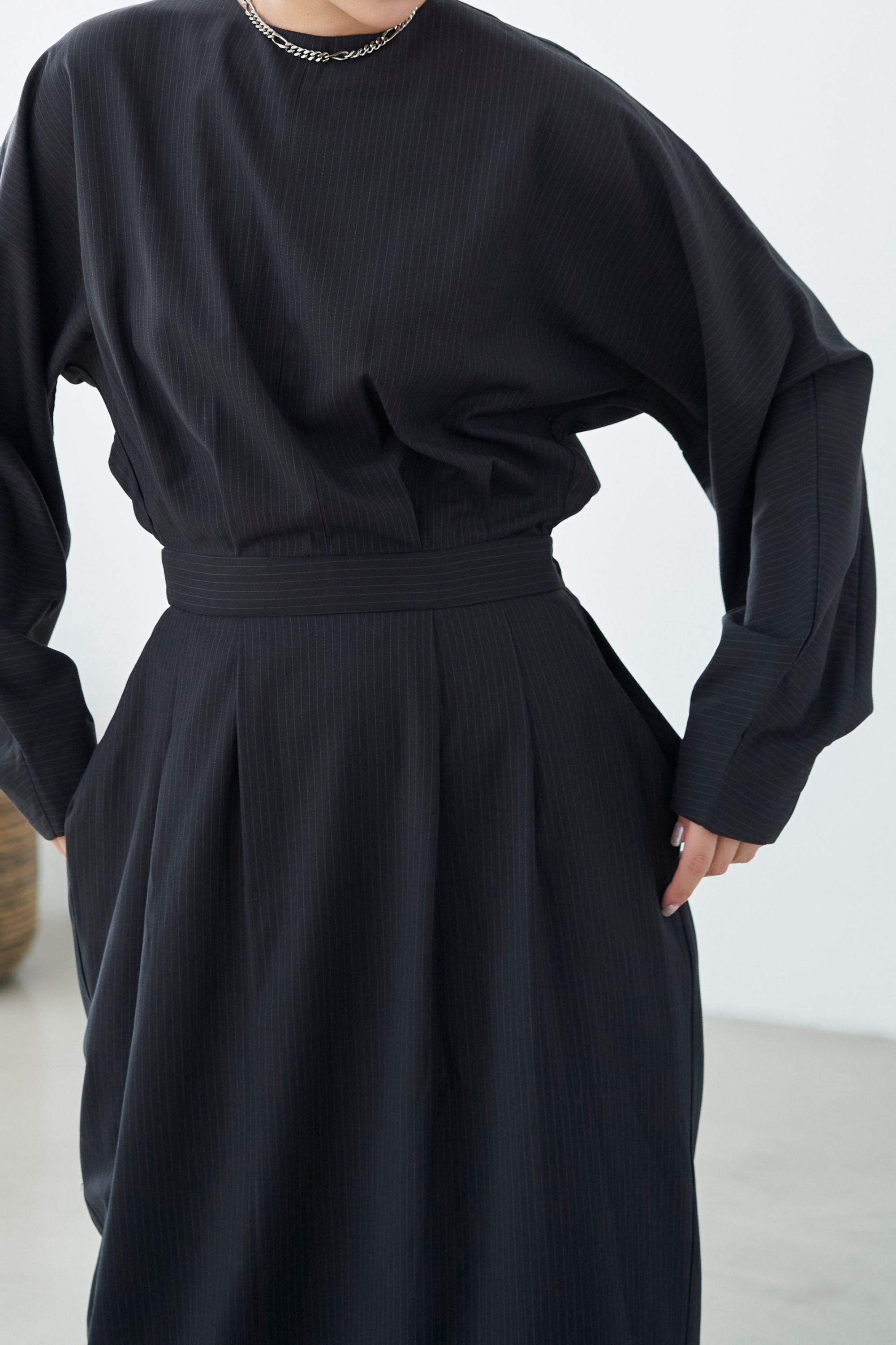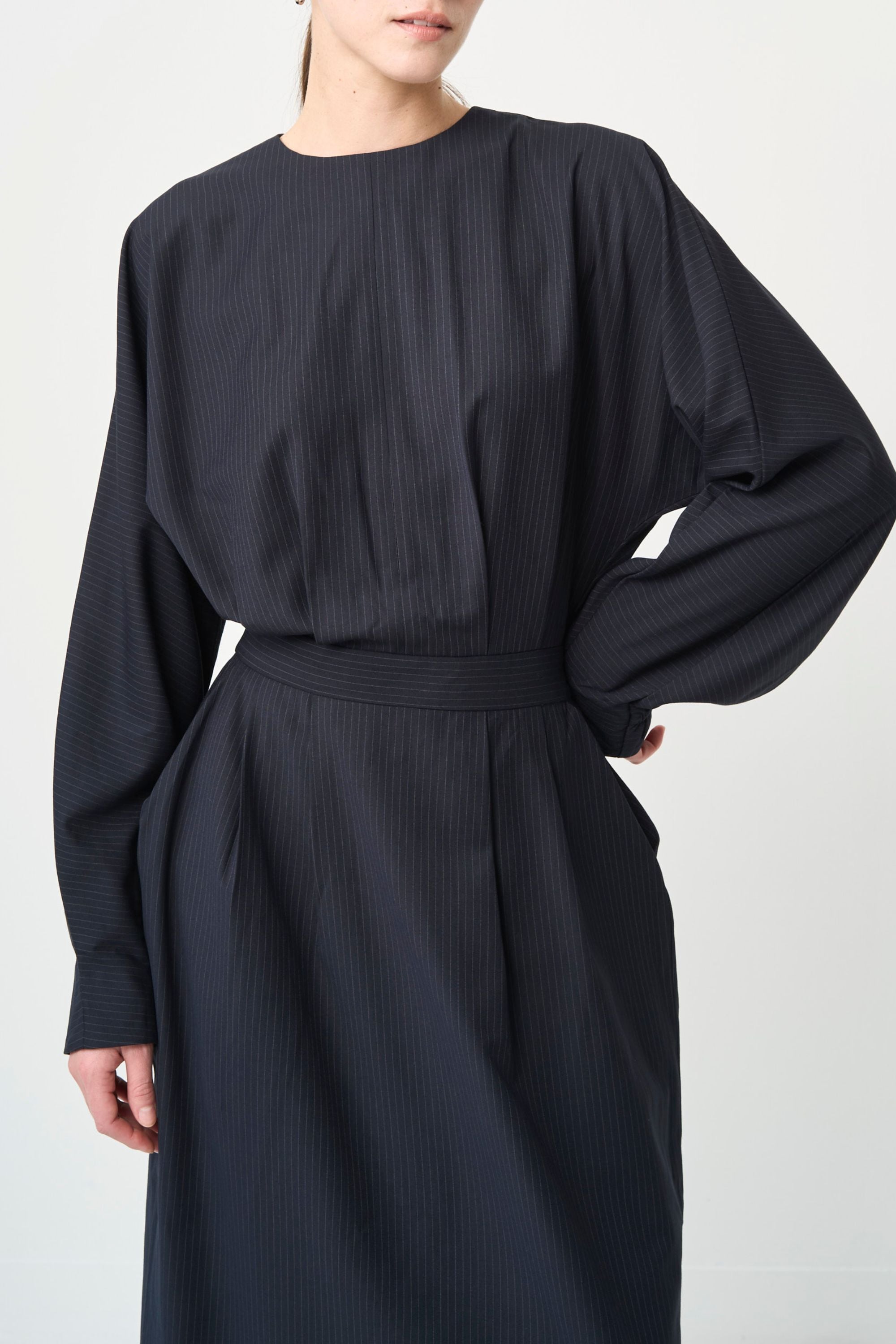 ピンストライプの生地は高級感と秋冬らしい印象のある一枚に
