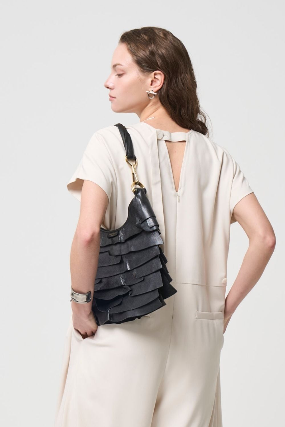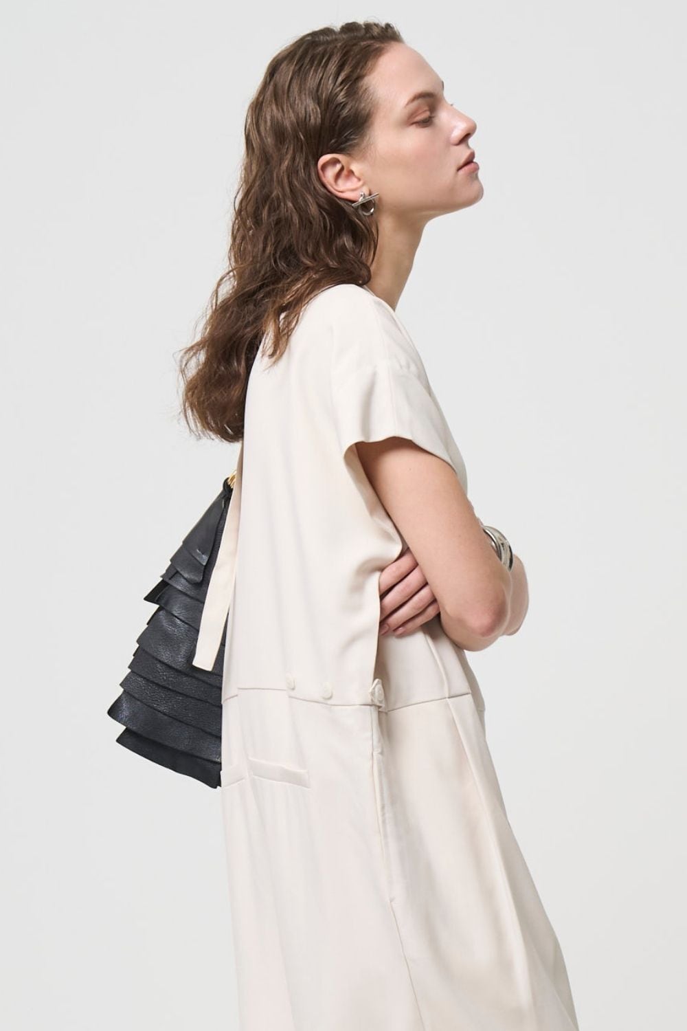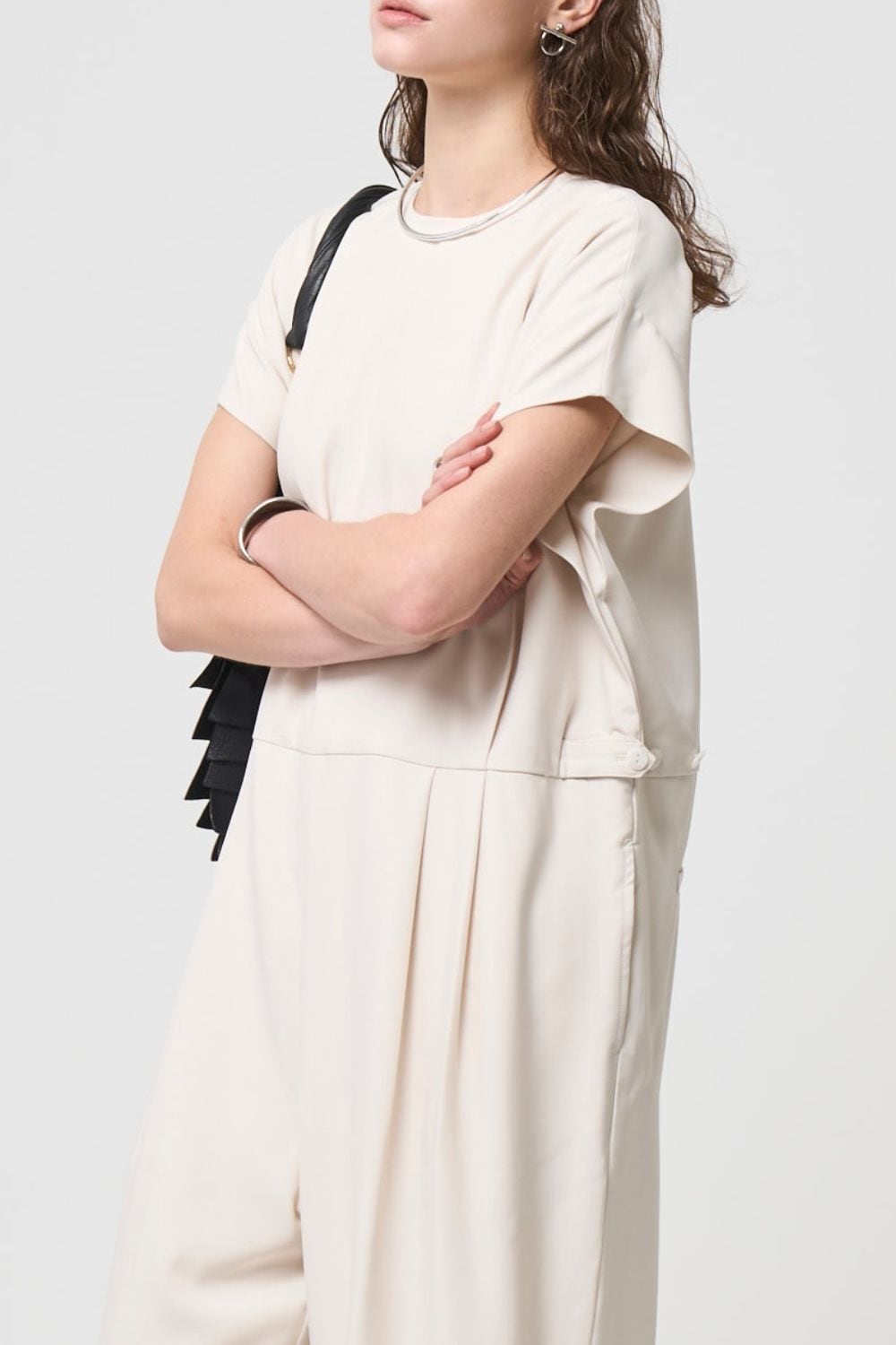 ハリのある生地でマニッシュな印象を残しながら