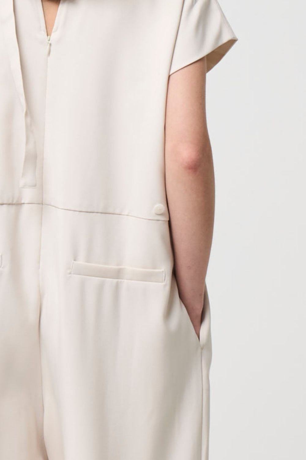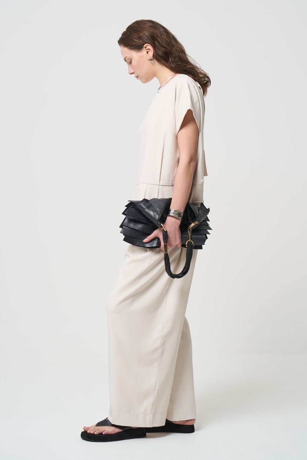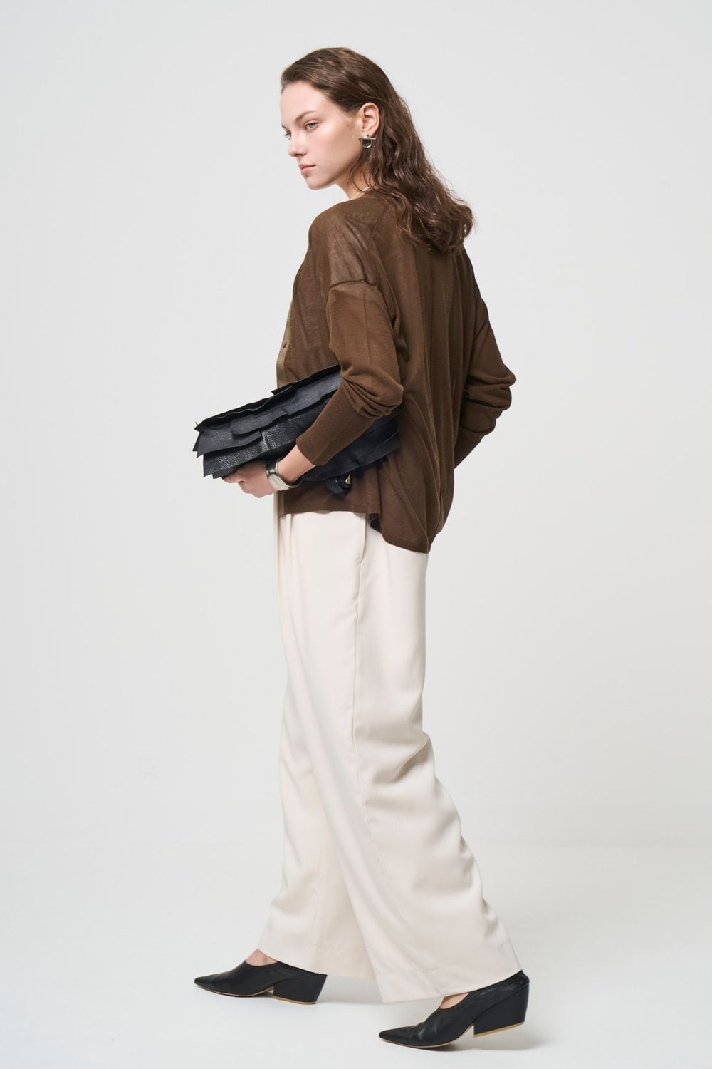ハリのある生地でマニッシュな印象を残しながら