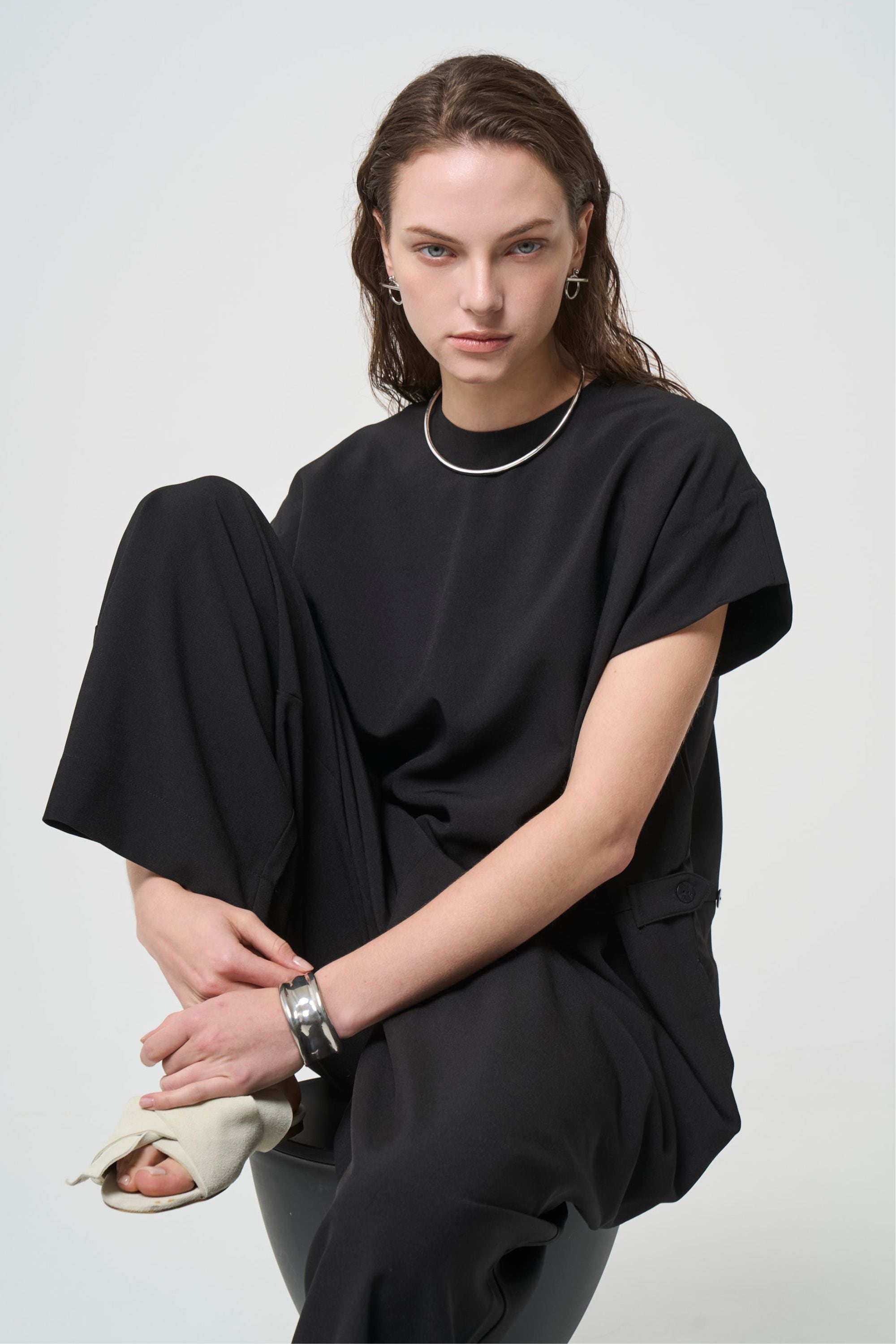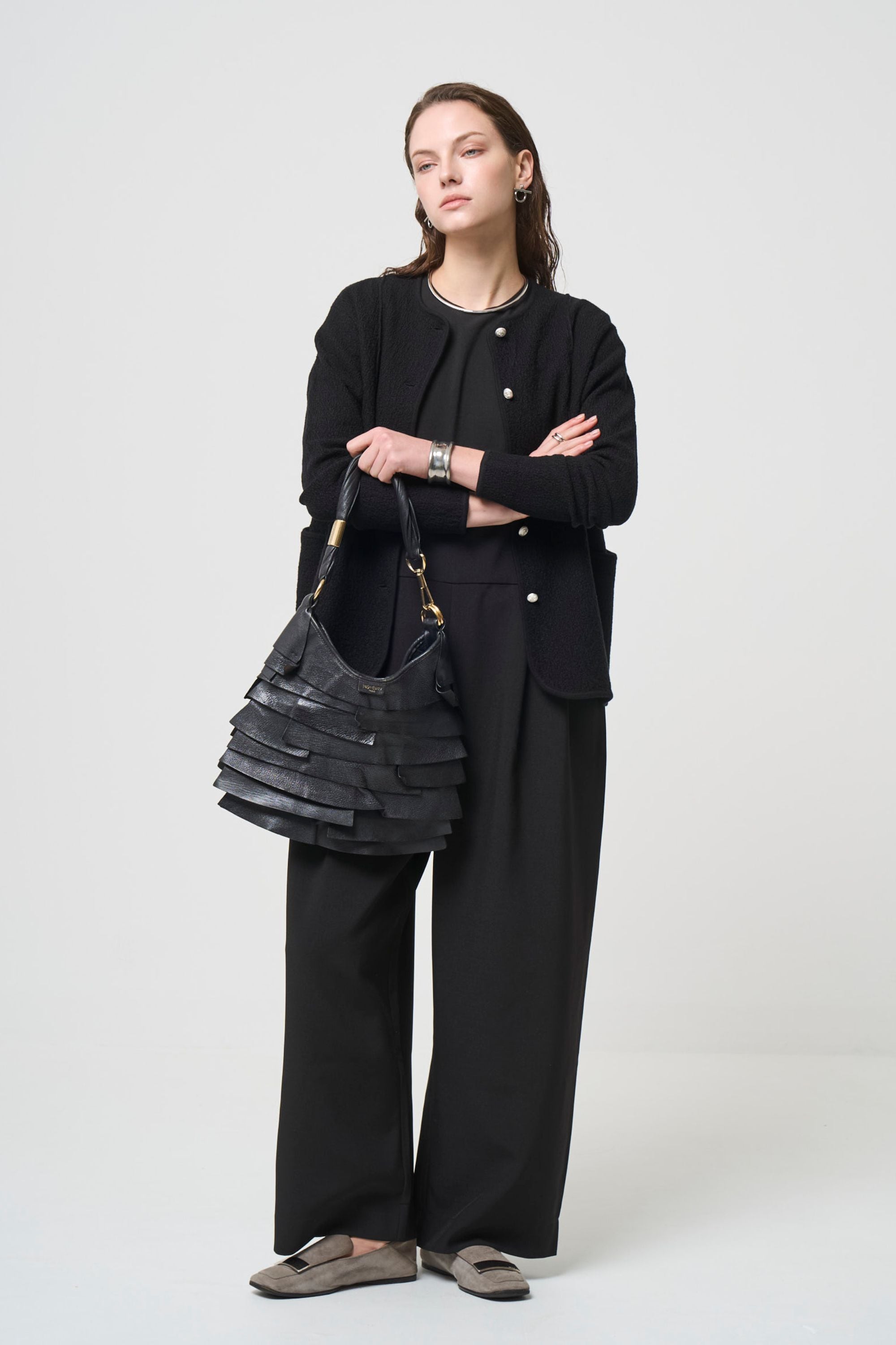 ハリのある生地でマニッシュな印象を残しながら